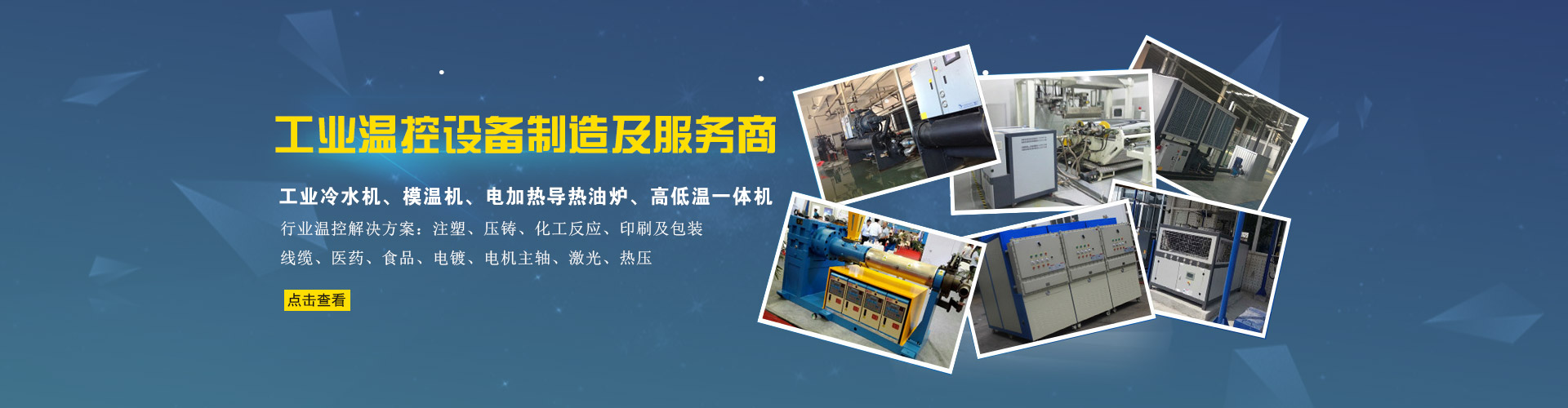 我們的產品主要包括:冷熱一體機、油循環溫度控制機、水循環溫度控制機、工業冷水機、冷油機、螺桿式冷水機、熱泵機組、蒸發式冷凝機組。針對不同行業的專業溫度控制需求,公司還研發出了行業專用溫控設備,如變速箱檢測專用冷熱一體機、橡塑專用水溫機、壓鑄專用油溫機、防爆模溫機、液壓系統專用冷油機等。